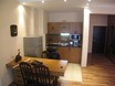 The apartment is on the third floor without a lift but the stairs are low and very easy to climb. It is very spacious and because it has southern exposure is very bright and warm. The living room has two arm chairs and a sofa and a decorative old fire place beautifully renovated. The kitchen has all the necessary appliances – fridge, stove with oven, microwave, washing machine, etc, and there is also a dining table with four chairs. The bedroom is also very spacious and has a very stylish and modern look thanks to the beautiful ornaments on the walls and the special lightning. There is also a balcony that has a view towards National Palace of Culture. The apartment has central heating and air-conditioning in both rooms. The apartment is a great accommodation option for every one looking for a stylish and modern apartment in the heart of Sofia.